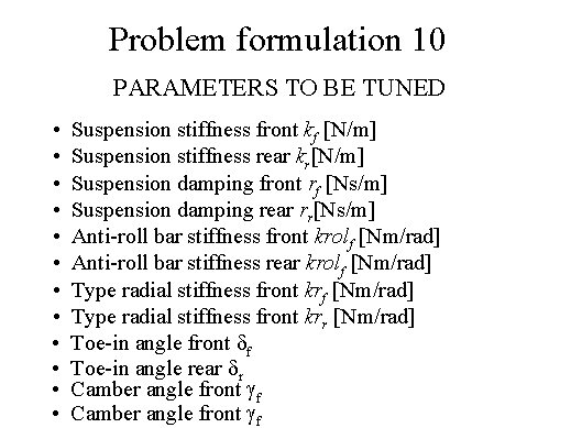 To obtain the best compromise with respect to the dynamical behaviour in all the considered situations, we have tried to tune 12 parameters, which refer to the suspension system.