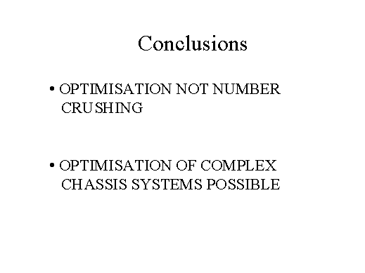 optimal values. Anyway the optimisation of a complex model in order to get good handling and road holding performances is possible. We have managed to deal with a complex problem and we have managed to derive a method to optimise the chassis of a car. |