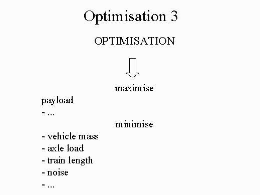 To optimise a railway vehicle, we have to maximise the payload and minimise the vehicle mass, the axle load, the train length and the noise.