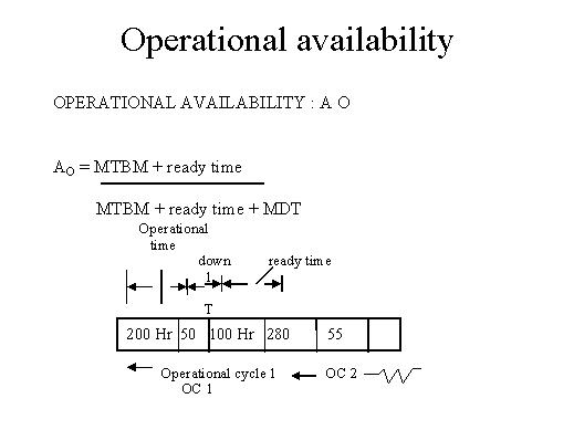 There are two/three different types of Availability. One of the most important is Operational Availability. When the scenario goes well with a machine, or a system or a particular factory without any troubles during operation it is called Operation Availability. The operational availability is given by the expression Ao. Here we give only a few important definitions of the terms. There are a few points to note with the operational reliability. The time under question of operation reliability (Ao) can be subdivided. It is into Operational time, Down time and Ready time. When the machine is sent for repair it will take sometime to be brought back to normal operating condition. |