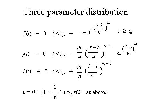 | Similarly, a three parameter Weibull distribution can be also cited. The t0 used when you are not taking the records from the beginning, but you are taking them after a time t0 has elapsed. This t0 is also called the Location Parameter. Here also we have a gamma function |