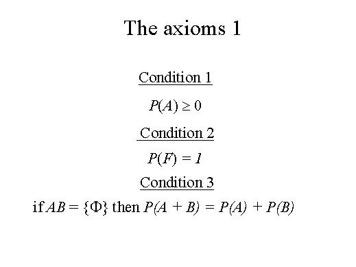 three conditions. These conditions are the axioms of the theory of probability. In the development of the theory, all conclusions are based directly or indirectly on the axioms and only on the axioms. |