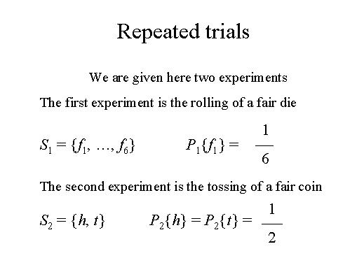 | We perform both experiments and we want to find the probability that we get "two" on the die and "heads" on the coin. If we make the reasonable assumption that the outcomes of the first experiment are independent of the outcomes of the second, we conclude that the unknown probability equals 1/6 x 1/2. |