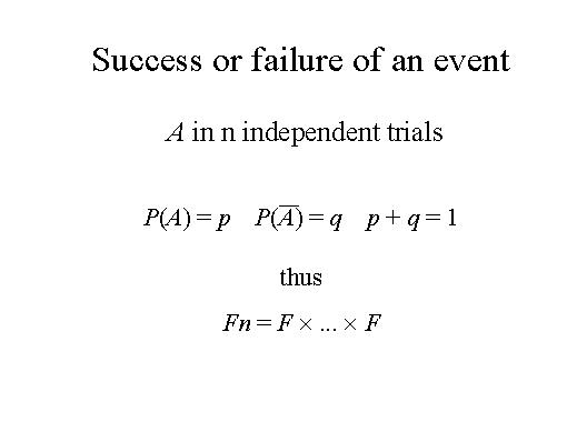 | We consider now our main problem. We are given an experiment F and an event A with the formulas here indicated . We repeat the experiment n times and the resulting product space we denote by Fn . We shall determine the probability pn(k) that the event A occurs exactly k times. |