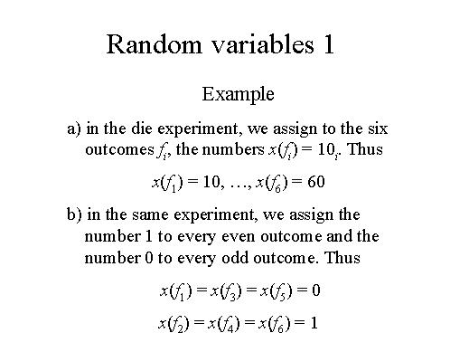 | A random variable (abbreviation RV) is a number x (z) assigned to every outcome z of an experiment. This number could be the gain in a game of chance, the voltage of a random source, the cost of a random component, or any other numerical quantity that is of interest in the performance of the experiment. |