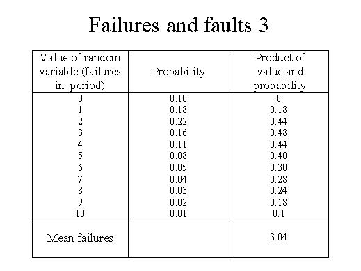 | The table illustrates a typical probability distribution of failures that occur within a time period of execution. Each possible value of the random variable of number of failures is given along with its associated probability. The probabilities, of course, add to 1. Note that here the random variable is discrete, as the number of failures must be an integer. We can also have continuous random variables, such as time, which can take on any value. Mote that the most probable number of failures is 2 (probability 2.2). The mean or average number of failures can be computed. Multiply each possible value by the probability it can occur and add all the products, as shown. The mean is 3.04 failures. |