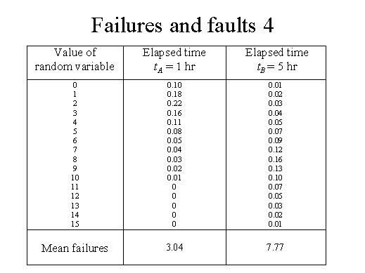 | The table illustrates an example of the random process of failures in simplified fashion, showing failure distributions of the cumulative number of failures experienced at two different time points. Note that the random variables are given at elapsed time tA of 1 hr and elapsed time tB of 5 hr. A random process whose probability distribution varies with time is called non-homogeneous. Most failure processes during test fit this situation. |