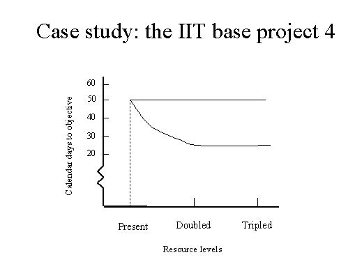 | Finally, the effects of resource changes are indicated in this figure. Overtime and additional personnel have negligible effect on schedules for this project at this point in its history. Making more computer time available has substantial effect. This indicates that this project is essentially though not completely limited by computer time available. If the manager can make both more computer time available and back off on the failure intensity objective, it may be possible to change the estimated completion date even further. Note that we cannot generalize to other projects. Effects of resources changes are specific to a particular project and time. |