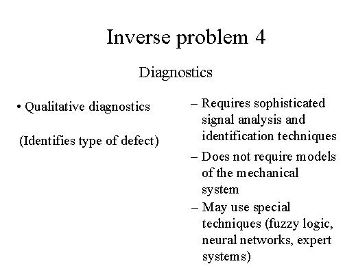 | The shown procedure is not the only way to make diagnostics. We can make qualitative diagnostics, which requires sophisticated signal analysis and identification techniques, but does not require any model of the mechanical system. We do not need to use a model of the system in this kind of diagnostics. However it is only possible to determine the type of the malfunction but not its position nor its amount and phase. |