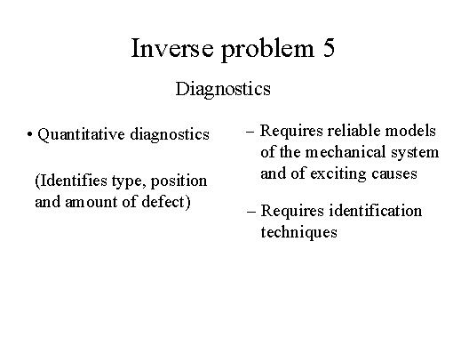 The quantitative diagnostics, which identifies the type, the position and the amount of the defect, requires a reliable model of the complete system and also of the exciting causes. Then it requires some robust identification technique.