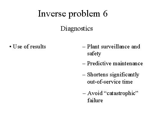 | The results of this diagnostic procedure can be used for the surveillance and for the safety of plants. Also predictive maintenance can be performed on the basis of the diagnostics results. Also the out-of-service time can be shortened significantly since the diagnostics results give the exact position of the fault. Finally an automatic diagnostic procedure can avoid "catastrophic" failure which can be very dangerous for the plant and for the people working in the plant. |