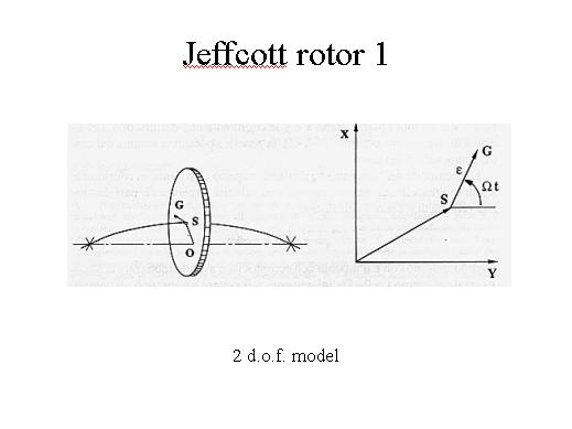 | We can take into consideration the Jeffcott rotor again, composed by a rigid disk mounted on a symmetrical flexible rotating shaft supported by two rigid bearings. This rotor system has only two degrees of freedom (the displacements of the disk in horizontal and vertical directions) or, if we use a rotating co-ordinate system, still one d.o.f.: the radial displacement of the disk. The unavoidable excentricity of the centre of mass of the disk creates a centrifugal force due to the rotational speed, which deflects the flexible shaft as shown. Due to the deflection the centrifugal force increases: for each rotating speed the centrifugal force will be balanced by the elastic reaction force of the shaft |