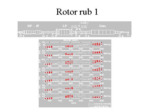 | Let us consider another experimental case, which is one real machine. We are considering some data relative to a rotor rub in turbogenerator operated by an electrical board. In this case the model of the turbogenerator is rather complex. We have a high-pressure turbine, an intermediate pressure turbine, a low-pressure turbine and a generator. There are seven oil film bearings, which support the rotors. In the lower part the values of the rotating speeds, which are used for the identification procedures are shown. |
