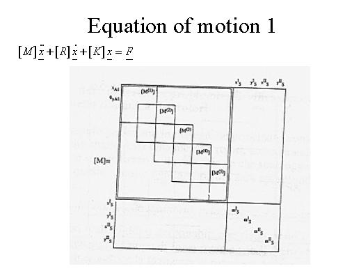| Finally it is possible to write the complete matrix equation of the motion, by considering all the function defined in the previous slides from 6 to 13 and applying the Lagrange's equation defined in slide 5. This way, it is possible to define the mass matrix [M] for the complete structure, as shown. |