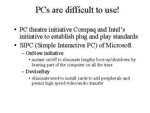 The basic problem with PC is that still PC is difficult to use. The first initiative is the PC Theatre initiative whereby we can achieve the plug and play. Another initiative is SIPC. One is the instant boot up and the second is the device bay.