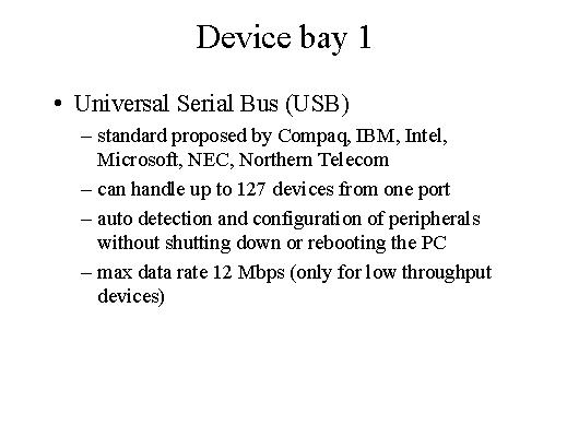 | One standard that has been developed is the Universal Serial Bus (USB), a standard proposed by Compaq, IBM, Intel, Microsoft, NEC and Northern Telecom. It can handle up to 127 devices from one port, auto detection and configuration of peripherals without shutting down or rebooting the PC. A maximum data rate of 12 MBPS for low throughput devices is supported. |