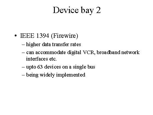 Another important standard is IEEE 1394, called firewire. This supports higher data rates, can accommodate digital VCR, broadband network interfaces etc. Up to 63 devices on a single bus can be connected. This is being widely implemented.