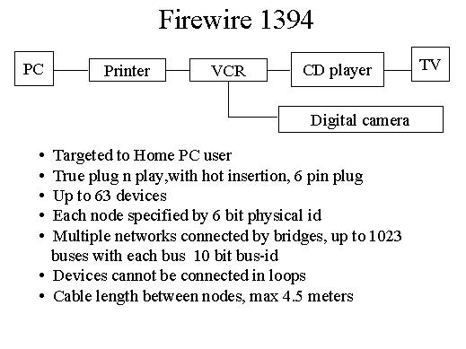 | The firewire can be used in home segment. The PC can be connected to printer, VCR, CD player, digital camera etc. It supports true plug and play, i.e., hot insertion is possible. Each node is specified by 6-bit address and hence a maximum of 63 devices can be connected. 1023 devices can be supported on multiple buses and hence corporate network can use this standard. The devices cannot be connected in loops and the maximum distance is 4.5 meters. |