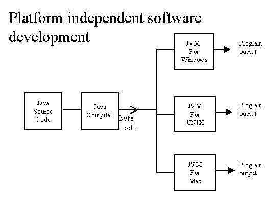| The greatest development that took place in the recent years is the platform independence through Java. As shown in the figure, the Java source code is converted into byte code which runs on the virtual machine. The byte code is independent of the platform i.e. we can run the byte code on any platform-operating system or hardware. The Java Virtual Machine (JVM) can run on Macintosh, Windows or UNIX systems and hence developing platform independent software is reduced to developing the JVM for different platforms. |