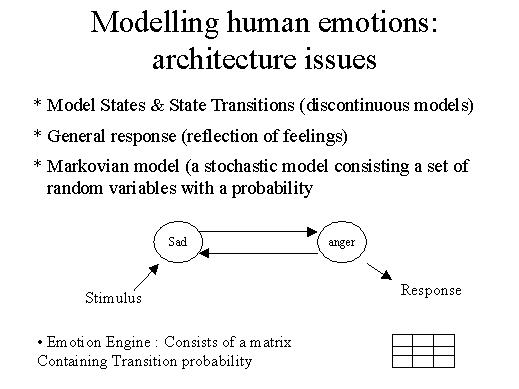 | Another major issues is how to model human emotions. Because of lack of good mathematical models, human emotions were not modelled earlier. But in recent years, the research focuses on development of emotion engines. Based on a matrix containing transition probability, human emotions are represented in the computer. The human emotions can be modelled as a finite state machine, each state representing an emotion. When a stimulus is given as input to one state, the machine moves to another state (another emotion). A finite state machine can be converted into a software program and hence, we can easily model human emotions. |