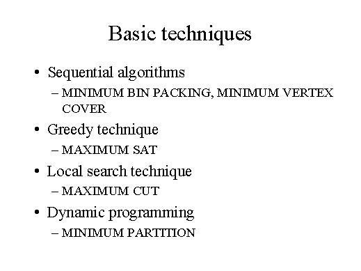 algorithms. The first technique is the "development of sequential algorithms": with this technique we will be able to give approximation algorithms for the minimum bin packing problem and for the minimum vertex cover problem. The second technique is the "greedy technique": by using this technique we will able to show that the maximum sat problem is approximable within performance ratio of 2. Then we will switch to the local search technique.: by using the local search technique we will be able to show that the maximum cut problem is approximable within performance ratio of 2. Finally by using another well known technique, that is "dynamic programming minimum partition" will be able to develop an approximation algorithm for minimum partition problem. |