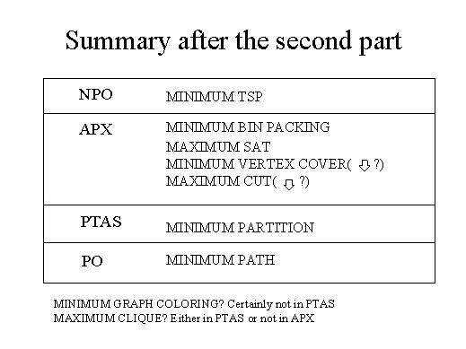 and then we will able to show that And then we will able to show that the minimum partition is not solvable in polynomial time. But still some remain open Moreover we will able to show that the graph colouring is not in PTAS, but is this problem in APX |