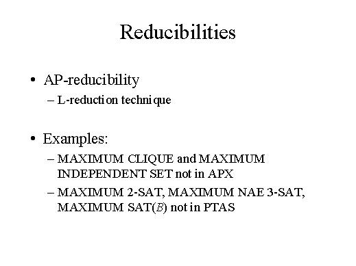 introduce one of the main tool to prove negative results. As in the case of decision problem we will introduce the notion of reducibility between two optimisation problems basically an approximation preserving reducibility which allows us to say that a problem A is easier to approximate than a problem B, in the sense that is we have an approximation algorithm for problem B that we can develop an approximation algorithm for problem A. The notion of reducibility that we will introduce is the AP reducibility as a special case of AP reducibility and we will also define the reduction technique which as far as I know is the most used technique to prove reducibility among optimization problems. I will give you several examples. For instance, I will be able to show that maximum clique and maximum independent set are not in the class APX, or that maximum 2-sat, maximum nae 3 sat, maximum sat(b), all these problems do not admit a polynomial time approximation scheme. |