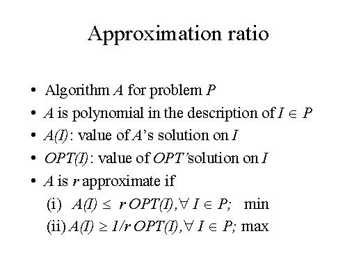 the optimal solution for instance I. We say that the algorithm A is r approximated if for any possible instance of the problem, the solution given by A is at most r times the optimal solution for instance I. This is for minimisation problem. On the other hand, if we deal with a maximisation problem, our algorithm is said to be r approximated if for every instance I of the maximisation problem we get a benefit that is at least a fraction r of the optimal solution. |