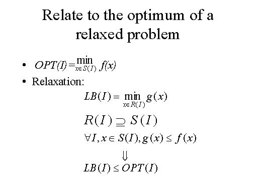 problem. Let us define what is a relaxation of a problem. We deal with problems where we want to minimise over all the feasible solutions for a given instance I a given function f. We can relax these algorithms in the following way. Rather then considering the set of feasible solution S(I), we consider a larger set of solutions that we denote by R(I). Then we define a different problem on a different objective function. We call this problem LB(I). Rather then computing the optimum, we compute this value LB(I) that is the minimum over all the solutions in the new set of solutions R(I) of a function g(x). Function g(x) has the following properties: for every instance and every possible solution in the original set solution S(I), g(x) is less o equal than f(x). From this we know that this function LB is smaller than the optimal solution. This is called a lower bound on the optimal solution. |