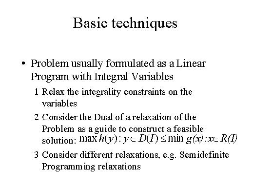 different techniques. A first technique is based on the formulation of the original problem as a linear programme with integral variable. As we will see many combinatory optimisation problems can be formulated as linear programming problems with integral variables. This is very hard to solve. A second technique that we will use is the following. A very effective way to write good lower bounds is that of using the dual problem of a relaxation of the original problem. We first consider a linear problem formulation of the original problem, then we relax the integrality constraints, then we write the dual problem of this formulation. A third method that we will consider is based on the use of relaxations that are not linear. In particular, we will see that in some cases we can get much better bounds on the optimal solution by using the semi-definitive programming relaxation. Here the relaxation will be pretty peculiar. What we do is to relax the problem by projecting this problem in a different space with a number of dimension equal to the number of variables. |