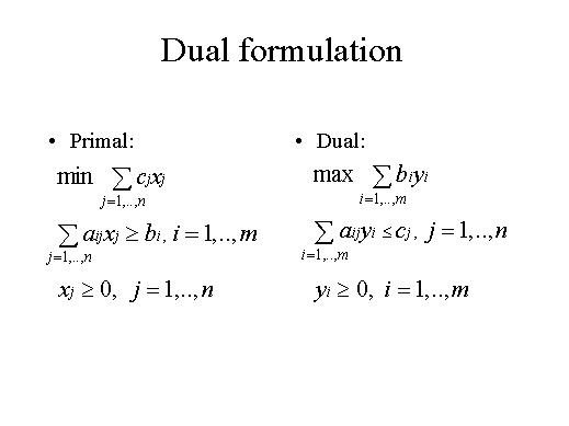 | In the dual formulation of a linear program we associate every dual variable to a constaint in teh primal solution and a cosntraint to every variable in the primal solution. We seek for finding the best lower bound that is a linear combination of the dual variables subject to a set of constraints. |