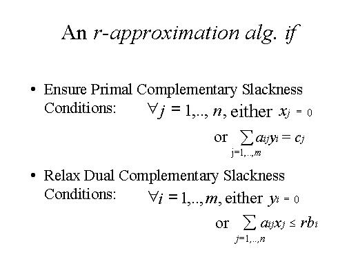 primal and for the dual. We have an r-approximation algorithm if, when we have finished the execution of the algorithm based on the primal-Dual Schema, we ensure the primal complementary slackers conditions that says that for every j either variable xj is equal 0 or the constrains in the dual are satisfied with equality. We relax the dual complementary slackness conditions and say that for every i either yi is equal 0 or the constraint in the primal is satisfied up to a factor r. |
