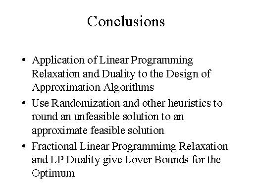 of approximation algorithm. In the next section we will see other applications of linear programming and other kind of relaxation and also the use of randomization in the rounding of solutions. |