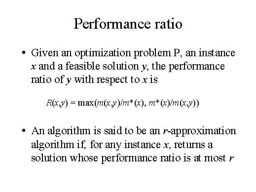 the so-called performance ratio. The performance ratio is the maximum between the measure of the computer solution and the optimal solution, or the measure of the optimal solution and the measure of the computer solution. Actually this seems a slightly complicated formula, but in this way we do not have to distinguish between maximisation problems and optimization problems. In both cases in fact the performance ratio will be a number greater than 1, and as closer is this number to 1 as better is the quality of the solution computed by our algorithm. So, we ca say that an r-approximation algorithm is said to be an r-approximation algorithm if, for any instance y, return a solution whose performance ratio is bounded by r. Where r is a given constant. |   |