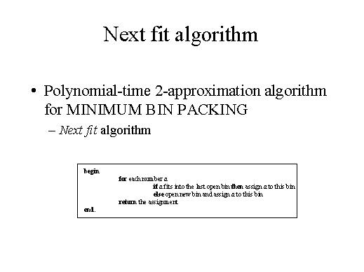 works as follows. We consider one item after the other and if the current item fits into the current bin. Then we put the item into the bin, otherwise we get a new bin and we put the item into this new bin. You have to think like if we have bins that come from right to left and we have one current bin and when we get a item we see if this item can fit into the current bin. If it can fit then we put it into the bin, otherwise we move the bin on the left and we take from the right another bin and we put the item into this bin. |