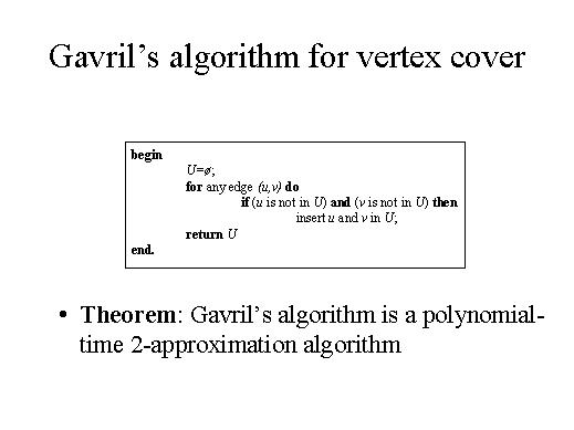 performance ratio is bounded by 2. We select one edge after the other and we check whether the extremes of this edge are already covered. If the extremes are not in the vertex cover, then we add to the vertex cover both extremes of the edge. This is very simple, but still very powerful because it is possible to prove that this algorithm computes in polynomial-time a 2-approximation solution. A prove of these results is based in the following observations. If you think about this algorithm, the resulting solution is basically form by a matching, that is a collection of edges, which do not intercept with each other. This is called the matching and the result solution of this algorithm is a matching. Since each edge of this matching has to be covered, it means that any solution has to take at least one node for each of these edges. Our solution takes 2 nodes for each of these edges, so this means that our solution is at most twice the minimum solution. |