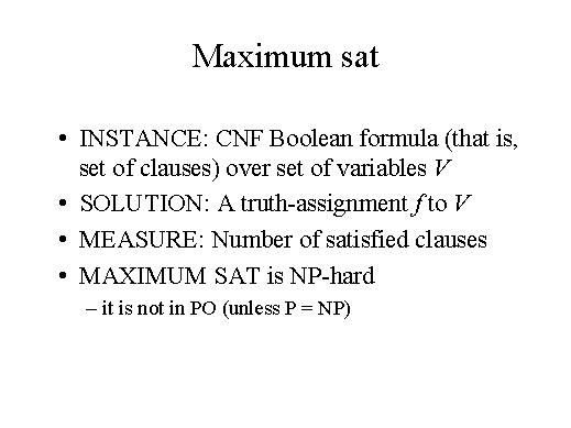 satisfied ability problem is very well known. In this case our instance is CNF Boolean formula (that is a collection of clauses) over set of variables V. And our solution is a truth-assignment f to V. The measure of our solution is a number of satisfied clauses. Of course this problem is NP-hard, it is not in PO (unless P = NP) |