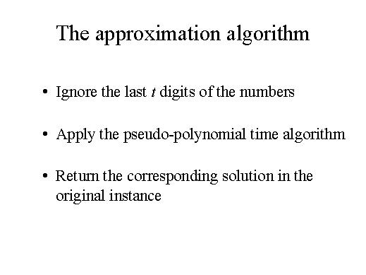 can be to make these numbers more. What we can do is to ignore the last t digits of the numbers, then to apply the pseudo-polynomial time algorithm, and then to return the corresponding solution in the original instance. By simple computation you can prove two things. The first thing you can prove is that if you first cut t digits and then you return the corresponding solution in the original instance, then you do not loose so much. Actually, you can prove that for any performance ratio you want to reach you can compute the number of digits you have to cut so that the return solution has the decided performance ratio. The second think you can prove is that the time complexity of this algorithm is polynomial in the and in the performance ratio you want to obtain. |