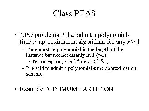 of a problem in this class. Actually this class contain problems that admit a polynomial-time r-approximation algorithm for any r > 1. In this case we have a polynomial time approximation algorithm for any part, so we can decide how must be our solution. Of course the time must polynomial in the length of the instance, nut we do not require that it is polynomial in the error. We have an example of a problem in this class, which is minimum partition, for which the time complexity is polynomial both in the length of the instance and in the error we have obtained In fact, we have shown that the minimum partition by dynamic programming can be shown to be in PTAS. |