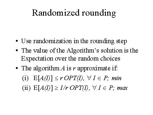| In this second lesson we will present more advanced applications of mathematical programming techniques for the design of approximation algorithms. In the first lesson we showed some basic examples of how mathematical programming techniques can be helpful in designing approximation algorithms. In particular, we showed an example of an application of linear programming relaxations and we also showed examples of an application of primal dual scheme, that is of algorithms that use the dual of a fractional relaxation of a linear program formulation as a guide to design approximation algorithms. In particular, we also discussed the fact that a fundamental aspect of designing similar algorithms is to provide a good rounding scheme. So, the first example we will see in this second part is that of designing an approximation algorithm for the max sat problem. In particular, the max weighted satisfiability problem. We will formulate this problem as an integer linear program, then relax the integrality constraints and finally we round the fractional solution to a feasible solution for the problem. Our main emphasis in this example is to show how randomization can be used in the rounded scheme. The ability of making probabilistic choices that are guided by the solution of the fractional relaxation may is in some cases a very useful tool to design better approximation algorithms. This is the first argument that we will treat in this second part. Since we have a randomized algorithm, we will have an expected value of the final solution where this expectation will be over all the random choices of the algorithms. In particular, we say that an algorithm A is rapproximate for a minimization problem if the expected solution given by the algorithm is at most r times the optimal solution. On the other hand, for a maximalization problem we will say that the algorithm is r approximate if the expected value of the algorithm is at least 1/r the optimal solution. And this should hold for every instance of the problem. |