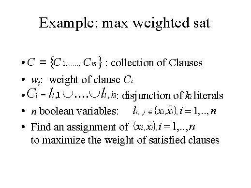 | Let's see this example: Max weighted sat. We have a collection of clauses. Every clause i has associated a weight. Clause C(i) has an associated weight w(i). And every clause is the disjunction of a set of k(i) literals. The literals are selected out of n different Boolean variables. So, this means that every literal is either a negated or an unnegated Boolean variable. So the goal in the max weighted sat problem is to find an assignment of the variables in a way that we maximize the weight of satisfied clauses. |
