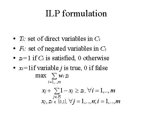 | Let us present an integer linear formulation of this problem. So, for every clause C(i) we define by T(i) the set of Boolean variables that appear unnegated in cross C(i). And by F(i) the set of Boolean variables that appear negated in clause C(i). Now let's describe the variables of the integer linear program formulation. We have a variable for z(i) for every clause that is equal to 1 if the clause is satisfied, 0 otherwise. We have also a variable x(j) for every boolean variable. This Boolean variable is 1 if variable x(j) is true, 0 otherwise. So, which is our integer linear programing formulation. We want to maximize the weight of a satisfied clause. So, the objective function would be the sum over all the clauses of the product of the weight of the clause times the variable that indicates if the clause is satisfied. On the other hand, the clause to be satisfied, since every clause is in disjunctive form, must have at least one true literal true. So, for all of the true literals in the clause, we have that the sum of the variables x(j) for all the true literals plus the sum of all the negated variables for all the negated literals must be at least z(i). This means that a Boolean variable associated with a true literal must be 1 or a Boolean variable associated with a false literal must be 0. Moreover, in the integer linear programing formulation of this problem we have that x(j) and z(i) must be either 0 or 1. We do is to drop these integral constraints so that x(j) may be any variable between 0 and 1. z(i) must be between 0 and 1. And, this has no interpretation in terms of setting to true or to false a variable because setting a variable to an intermediate value is senseless. But we will see how we can exploit this in our rounding scheme. |
