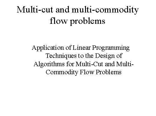 | Now we want to go further and show a further example of application of linear programming techniques and of the relationship between the primal and dual of a problem to the design of approximation algorithm. In particular, we will show two algorithms. The first algorithm for the multi-cut problem. The multi-cut problem is strictly related to the multi-commodity flow problem. And, as a second problem we will present an approximation algorithm for the multi-commodity flow problems without using linear programming techniques. |