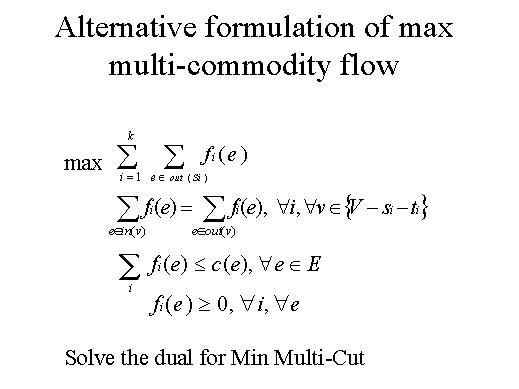 | On the other hand we can also make something different. We can give an alternative formulation of the multi-commodity flow with a polynomial number of constraints and a polynomial number of variables and then derive the dual of this formulation and solve the dual of this formulation. |