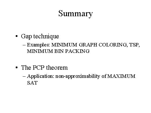 which is called gap technique. By using this technique I will give you some examples of non-approximable results. In particular, I will show that it is not possible to approximate the minimum graph coloring problem, it is not possible to approximate TSP at all and also it is not possible to approximate the minimum bin packing problem within a performance ratio smaller than 3 over 2. After this simple example we will need something more sophisticated. In particular we will need the so-called PCP theorem. By using this theorem we will be able to prove non-approximability results for the maximum satisfy ability problem. Starting for this non-approximability result it is possible to prove many other negative results. |