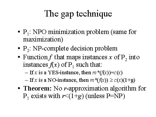 proceeds as follows. You want to prove a non-approximability result of an optimization problem, for instance let us consider a minimisation problem, the same for a maximization problem. So you have this problem and you want to prove that this problem not approximable within a given ratio. To this aim you can choose one NP-complete decision problem P2. What you do is to reduce basically P2 to the approximate solution of P1. In which way? You define a function f that maps instances of the decision problem into instances of the optimization problem, such that if the original instance is a positive instance then the optimum value of the final instance is a given value c(x), if on the other hand if the original instance is a negative instance, then the optimal value must be at least this value plus the gap. This is the gap that we are creating between YES-instances and NO-instances. |