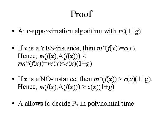then (1+g). If the original instance is a positive one, then the optimal value is equal to c(x), but this implies that the approximal solution has measure smaller then r times the optimal solution, which is equal to r times c(x).But since we are assuming that r is smaller then (1+g), then we have that the measure of the optimal solution is smaller then c(x)(1+g). On the other hand if the original instance is negative instance, then the optimal solution must be equal or greater then c(x)(1+g). But since this is the optimal solution, clearly every solution must be greater than this value. So we have derive a polynomial time algorithm that allows us to solve P2 in polynomial time. |