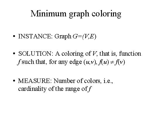 | The first application to these cases is the minimum graph coloring problem. This is a very well known problem, in which giving a graph we want to assign to each node of he graph a color such that two of the edge nodes have different colors. And of course we want to use the minimum number of colors. |