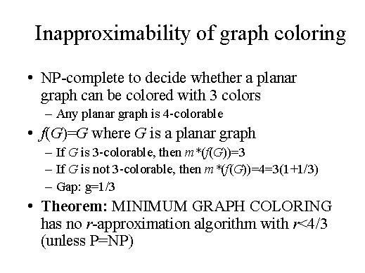 with 4 colors. So if we define our function f as the identity function, we have that if the original instance is 3-colorable then the optimal measure is equal to 3. On the other hand if the original instance is not 3-colorable the optimal measure of this graph is equal to 4. Since 4 can be written 3(1+1/3), we have a gap equal to 1/3. This implies that this problem cannot be approximated within a performance ratio smaller then 4/3, unless NP=P. |