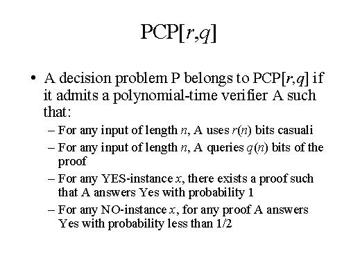 the verifier queries q(n) bits of the proof If the instance is positive, then there exits a proof such that the verifier answers Yes with probability one, while if the instance is a negative instance then for any proof then the verifier answers Yes with probability less than 1/2 |